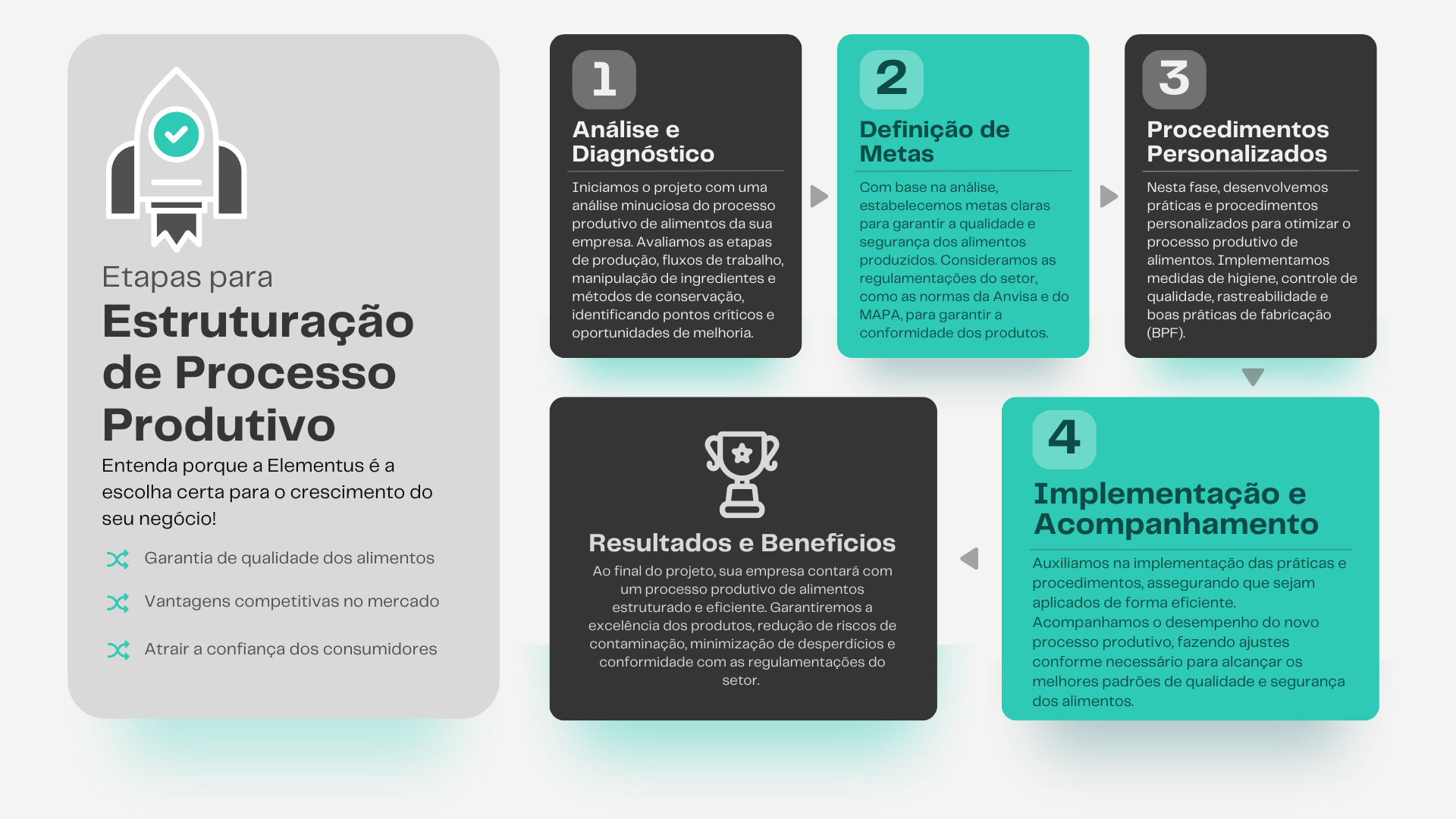 A estruturação de Processo Produtivo tem como objetivo principal melhorar a eficiência, qualidade e segurança do processo produtivo nas indústrias de alimentos.