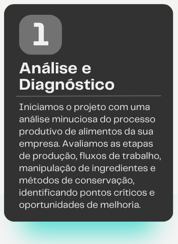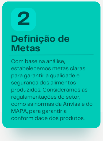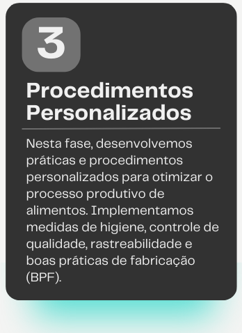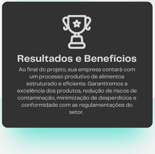Assim, ao estruturarmos o seu processo produtivo, nosso objetivo é aumentar a produtividade, reduzir custos, minimizar desperdícios e melhorar a qualidade dos seus produtos alimentícios. Além disso, ajudamos a garantir a conformidade com as regulamentações do setor e a fortalecer a reputação da sua empresa.